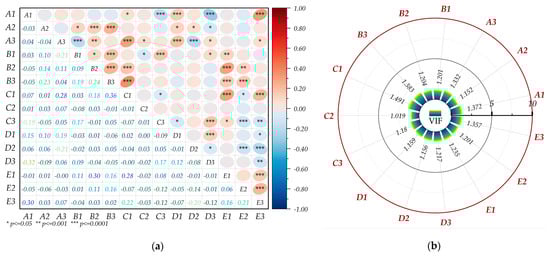 The indicator correlation matrix and Variance Inflation Factor (VIF): (a) Pearson correlation coefficient matrix; (b) Variance Inflation Factor (VIF).