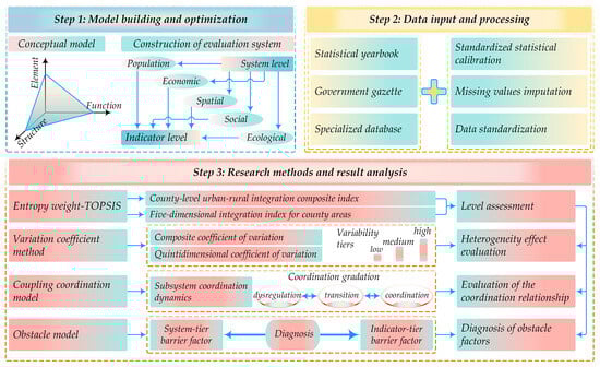 Although certain indicators share conceptual associations, they measure distinct yet complementary aspects within the same dimension. Their complementarity empirically outweighs potential overlap. The principle for assigning indicator directionality is clear: a positive indicator signifies that higher values correspond to greater integration levels, while a negative indicator denotes that increased values impede integration progress. Key examples illustrate this logic. For instance, higher values in ratio indicators such as “urban–rural income gap” (B1) and “urban–rural consumption gap” (B2) reflect a widening gap, negatively impacting integration; hence, both are negative. Similarly, a higher value for “environmental agriculture production” (E3)—indicating greater fertilizer application per unit sown area—signals increased environmental pressure, justifying its negative designation. To assess potential multicollinearity, this study calculated the Pearson correlation coefficient matrix among indicators and their corresponding Variance Inflation Factors (VIFs), presented in Figure 2. Analysis shows that the absolute values of all correlation coefficients remain under 0.8, and every VIF value is well below the threshold of 5. These results confirm the absence of severe multicollinearity. The observed independence among indicators thus validates their suitability for model construction. Because indicator selection must balance complexity, data availability, and scientific rigor, no index system can be fully exhaustive, and subjective arbitrariness must be avoided. Given the significant regional variations in population, land use, and culture across the 71 Wuling Mountain counties, this study employed relative indicators. Entropy weight–TOPSIS was then applied to measure county-level urban–rural integrated development. The technical pathway is detailed in Figure 3: evaluation index system of integrated urban–rural development at the county level.