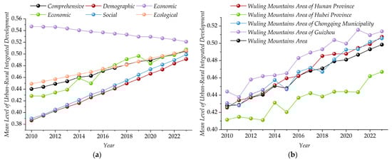 As shown in Figure 5, the urban–rural integration in the four dimensions of population, space, society, and ecology showed a fluctuating and slow upward trend from 2010 to 2023, while the economic dimension slowly decreased from 0.547 in 2010 to 0.521 in 2023, and each dimension gradually approached 0.50. From the comprehensive mean (Figure 5a), the integrated urban–rural development in the counties of Wuling Mountain area has shown a steady upward trend but is generally low, rising from 0.428 in 2010 to 0.502 in 2023, with an average annual growth rate of only 1.213% and a rise of only 17.38%. This indicates that there is significant room for improvement in the integrated urban–rural development in the sample counties. From the perspective of various provinces and cities (Figure 5b), there is an imbalance in the average annual growth rate of integrated urban–rural development at the county-level in the four provinces and cities, showing a hierarchical pattern of “Hunan Province > Chongqing City > Guizhou Province > Hubei Province”, with average annual growth rates of 1.46%, 1.23%, 1.15%, and 1.00%, respectively.