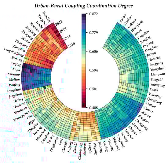 Variations in the urban–rural integration coupling coordination degree across the 71 counties in the Wuling Mountain area.