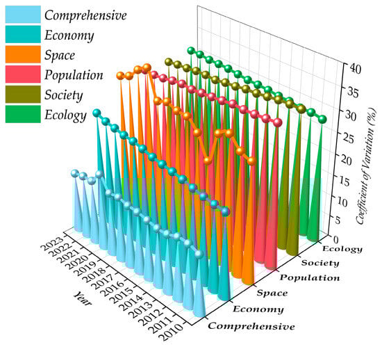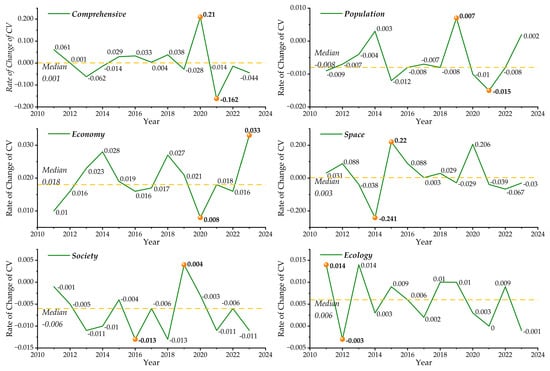 Based on the variation coefficient (Figure 8) and its rate of change (Figure 9), the degree of variation in the urban–rural integration in counties of Wuling Mountain area was classified into the following three levels with reference to the experience from the literature []: Low variation was referred to as 0 < CV ≤ 15%; 15% < CV ≤ 30% was considered moderate variation; and CV > 30% indicated high variation. The resonance was formed between the comprehensive CV change rate and the drastic fluctuations in the economic and spatial dimensions, while the negative change rate in the population and social dimensions confirmed that its heterogeneity slowed down but was not reversed. The specific analysis is detailed below.
