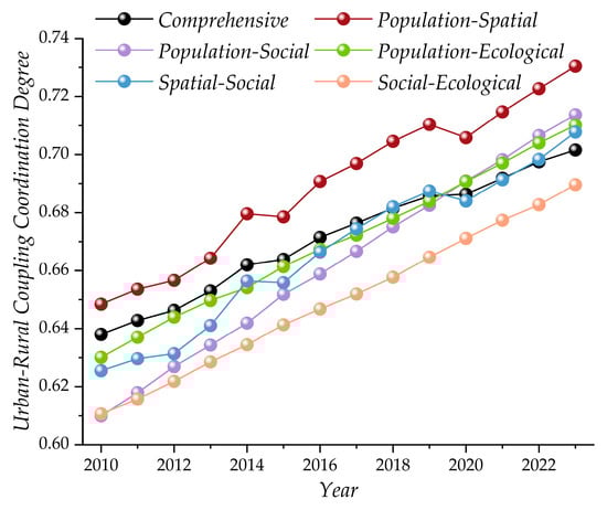 - The multidimensional coordination relationship was mainly influenced by the dual effects of spatial polarization and ecological constraints, its evolutionary path exhibited differentiated characteristics driven by multiple dimensions, and the “population–space” coupling coordination became the dominant mode. The comprehensive coupling coordination degree increased from 0.6380 in 2010 to 0.7016 in 2023, with an average annual growth rate of 0.52%. There was a significant difference in the coupling coordination between subsystems. During the sample period, the overall coupling coordination degree of 71 counties (cities, districts) was in the coordination stage, but it was still dominated by primary coordination. In 2018, the coupling coordination state began to trend towards spatial polarization, while the county coordination degree showed a characteristic of “polarization convergence” in 2023. Nearly 60% of counties achieved a level upgrade from the transition stage to the coordination stage, and the degree of advancement showed a “gradient increasing” trend.