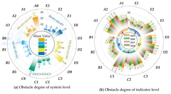 In order to further explore the obstacles and factors that constrain the integrated urban–rural development of counties in Wuling Mountain area, the obstacle degree model was employed to calculate the obstacle degrees at the system and indicator levels in 2010, 2015, 2020, and 2023. The calculation results are shown in Figure 12.