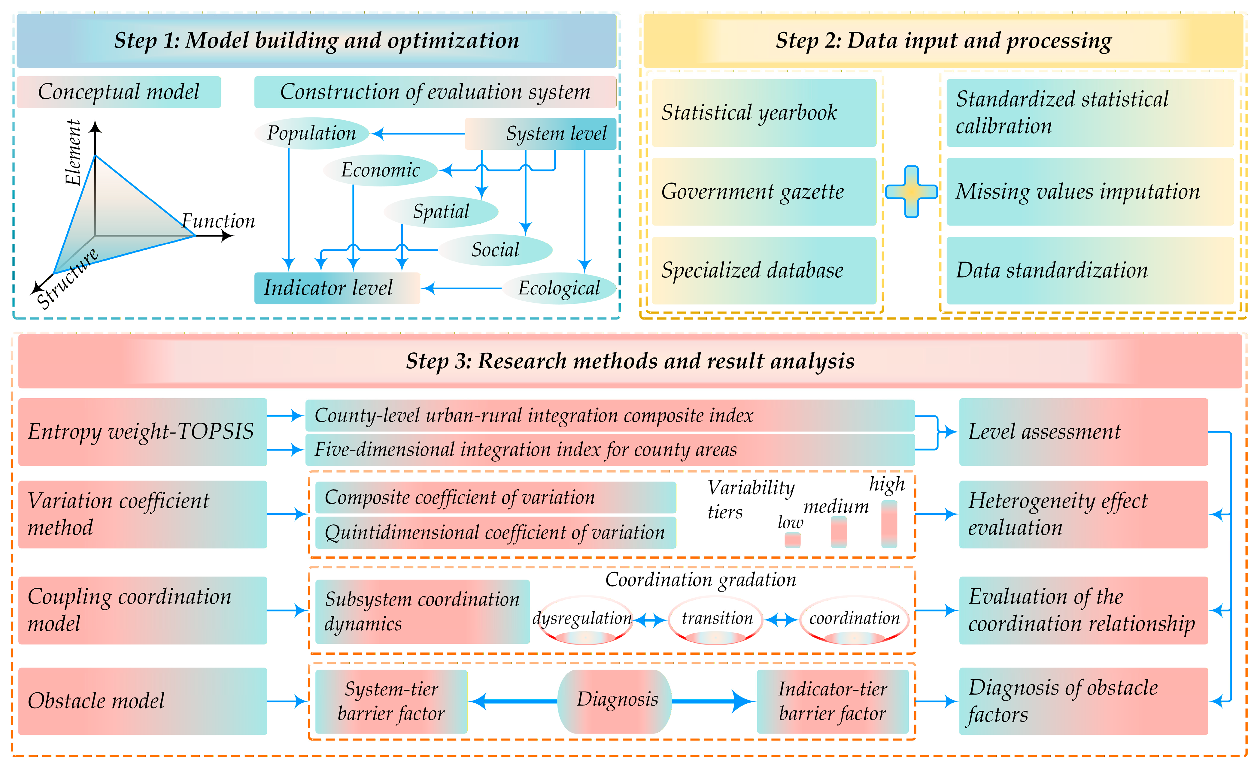 - Zhu, X.; Yu, F. Evolution characteristics, regional differences and influencing factors of urban-rural integrated development at the county scale: Take 64 counties in Wuling Mountain Area as examples. J. Nat. Resour. 2025, 40, 1386–1411. [Google Scholar] [CrossRef]