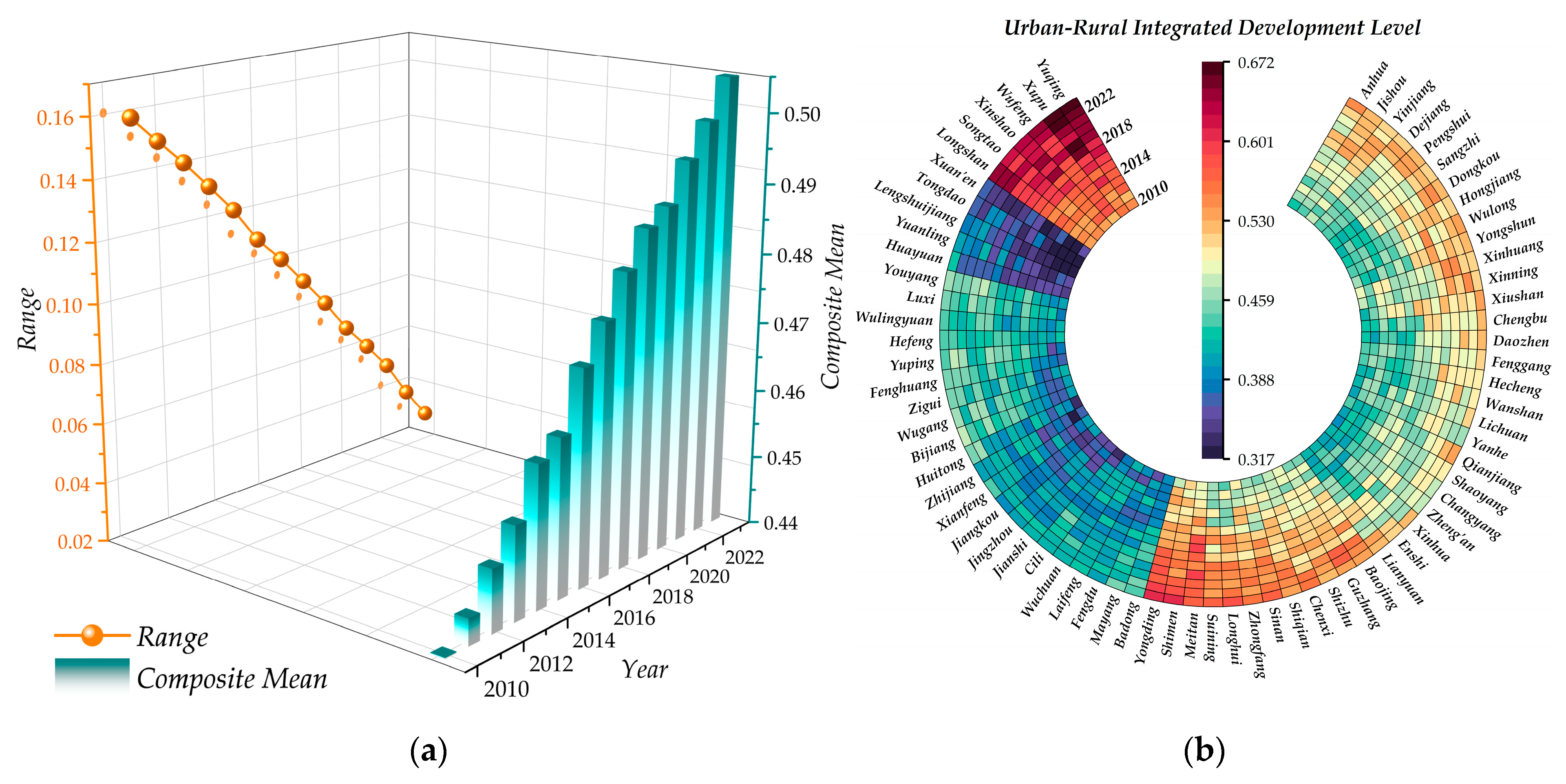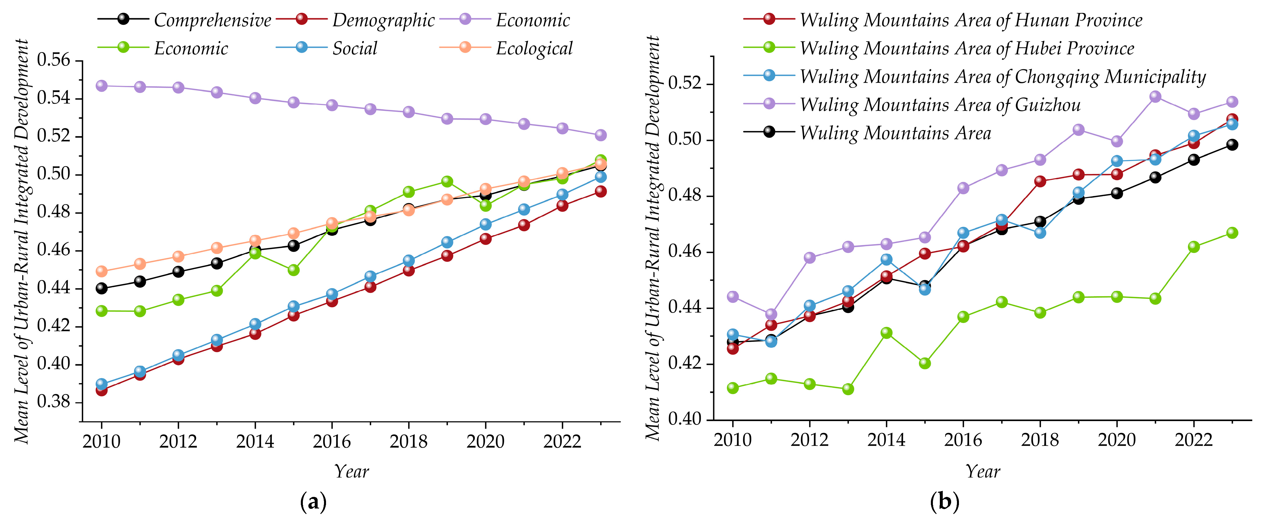 3.1.1. Analysis of the Evolution Characteristics of Urban–Rural Integration