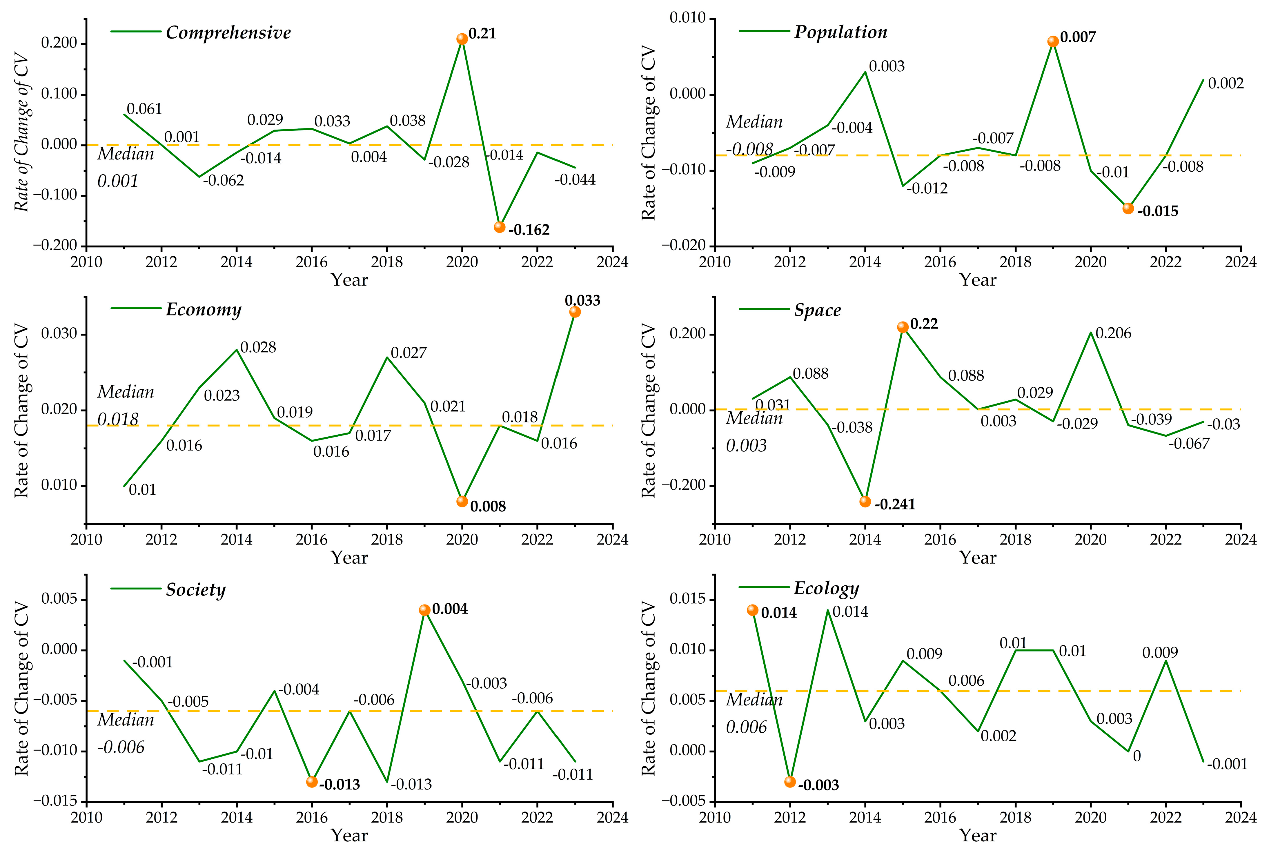 3.2.1. Evolution of Comprehensive Heterogeneity in the Integrated Urban–Rural Development at the County Level