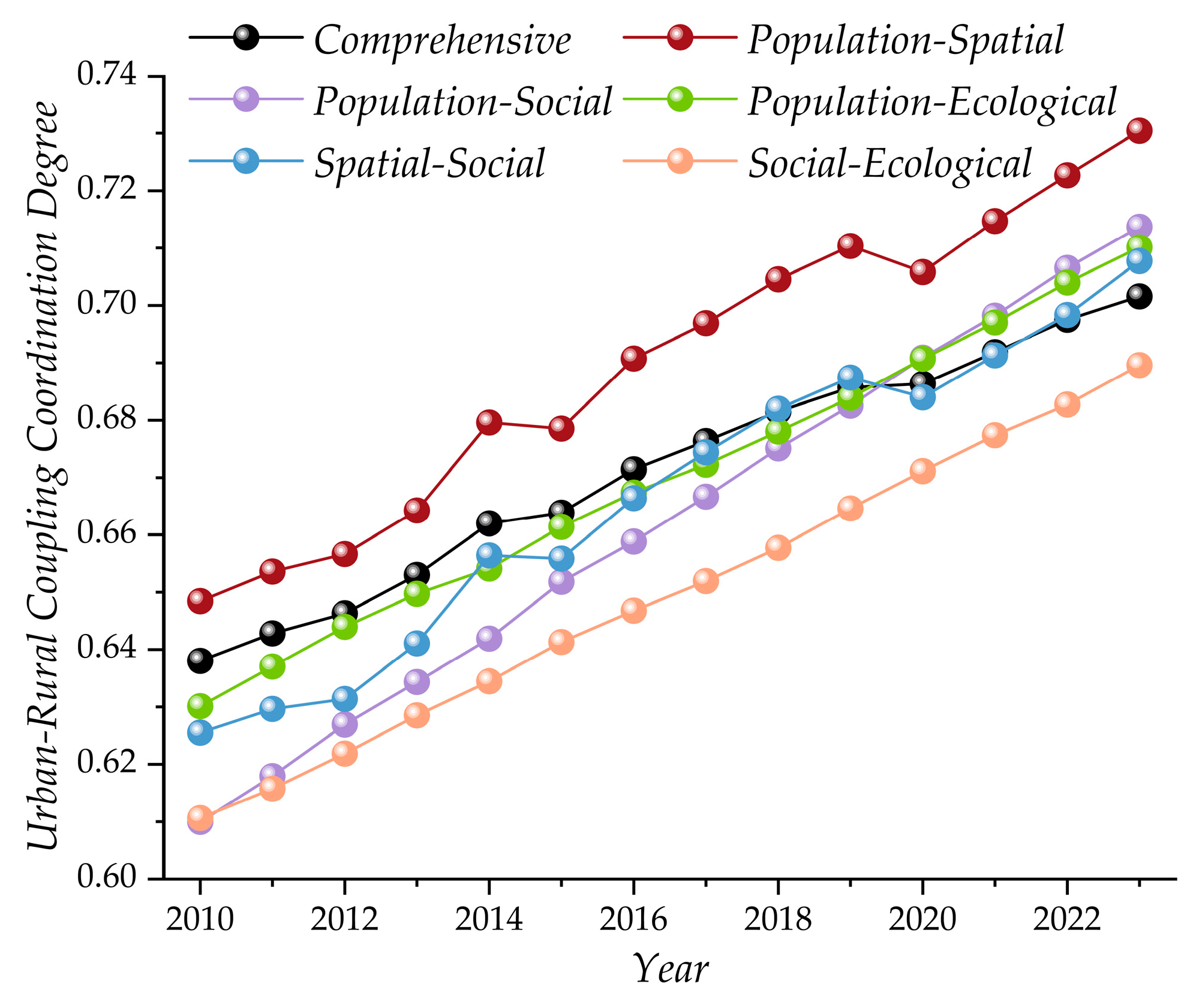 - The multidimensional coordination relationship was mainly influenced by the dual effects of spatial polarization and ecological constraints, its evolutionary path exhibited differentiated characteristics driven by multiple dimensions, and the “population–space” coupling coordination became the dominant mode. The comprehensive coupling coordination degree increased from 0.6380 in 2010 to 0.7016 in 2023, with an average annual growth rate of 0.52%. There was a significant difference in the coupling coordination between subsystems. During the sample period, the overall coupling coordination degree of 71 counties (cities, districts) was in the coordination stage, but it was still dominated by primary coordination. In 2018, the coupling coordination state began to trend towards spatial polarization, while the county coordination degree showed a characteristic of “polarization convergence” in 2023. Nearly 60% of counties achieved a level upgrade from the transition stage to the coordination stage, and the degree of advancement showed a “gradient increasing” trend.