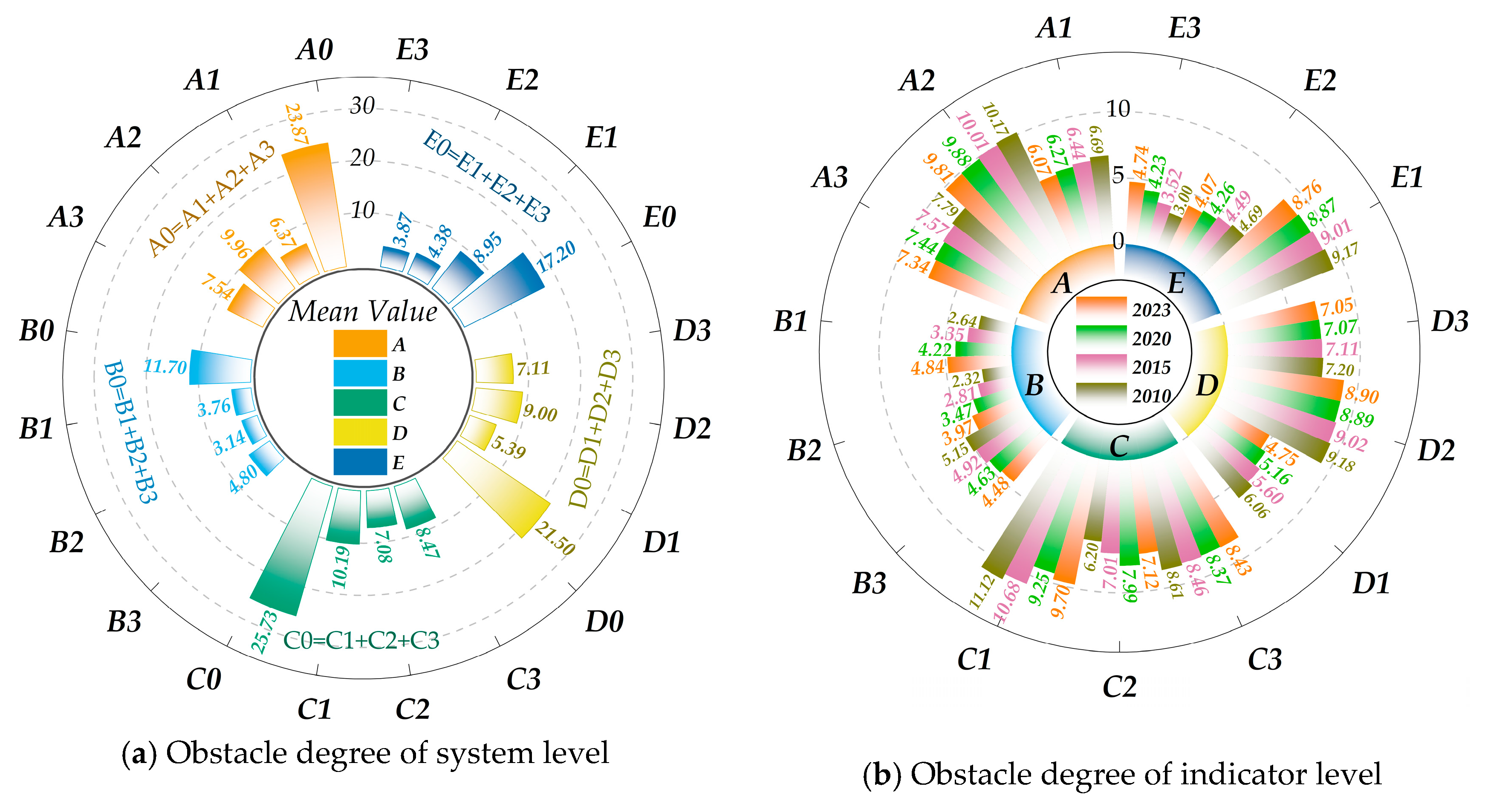 3.4. Diagnosis of Obstacle Factors for Integrated Urban–Rural Development in Counties of Wuling Mountain Area