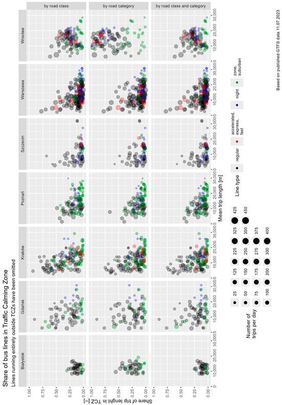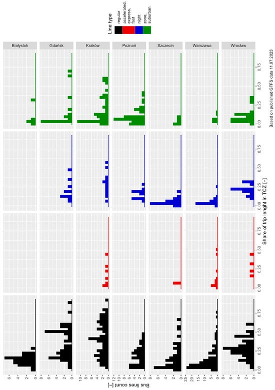 In the next stage of the study, GTFS data for PT in the selected cities were collected []. This data includes information about timetables, stop locations, and vehicle route paths. The data on vehicle route paths is optional []. Unfortunately, among the 10 largest cities in Poland, these data were available for only 7 cities, and the study was conducted for these cities. Due to structural differences, the data were converted into a uniform format. Data for 11 July 2023 were selected for this study. Subsequently, only bus lines were chosen from the dataset and grouped according to the type of line: