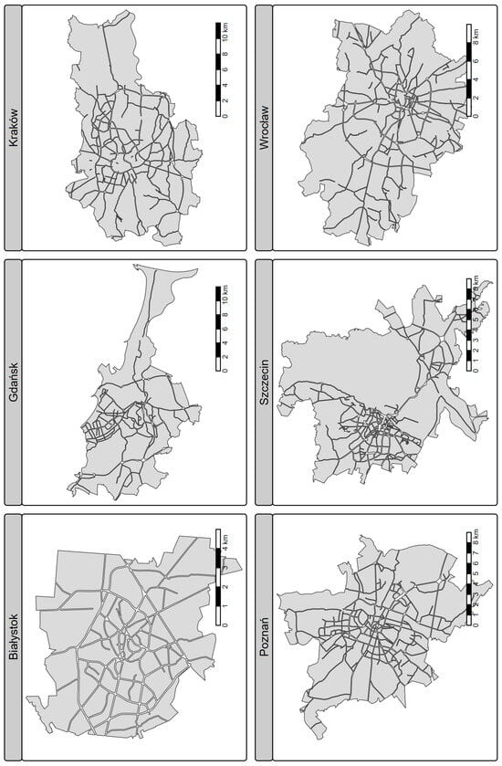 The first stage of the research involved collecting road network data for the 10 largest cities in Poland. The data were obtained from Poland’s official geoportal [] as a topographic objects database. Subsequently, data related to road carriageways were extracted. City boundaries were sourced from the National Register of Boundaries [].