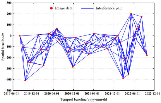 To form a sequence of interferometric pairs, each data point is systematically paired with its five nearest neighbors. This approach is formulated based on the baseline configuration of the gathered SAR dataset and the inherent behavior of regional ground deformation [,]. Specifically, 180 interferometric pairs were generated from 39 periods of RadarSAT-2 data, as shown in Figure 4. Based on the 24-day data sampling, the temporal baseline ranges from 24 to 120 days. Due to missing data in intermediate sections, some interferometric pairs exhibit longer temporal baselines, all of which remain less than 240 days. Interferometric processing is conducted on the pairs that satisfy the baseline requirements, generating a sequence of interferograms that are subjected to adaptive filtering. Following baseline estimation using precise orbital parameters, differential interferograms were generated, comprising phases associated with deformation, the atmosphere, and noise. A filtration criterion was then applied to remove interferograms corrupted by strong convection or those displaying significant residual fringes.