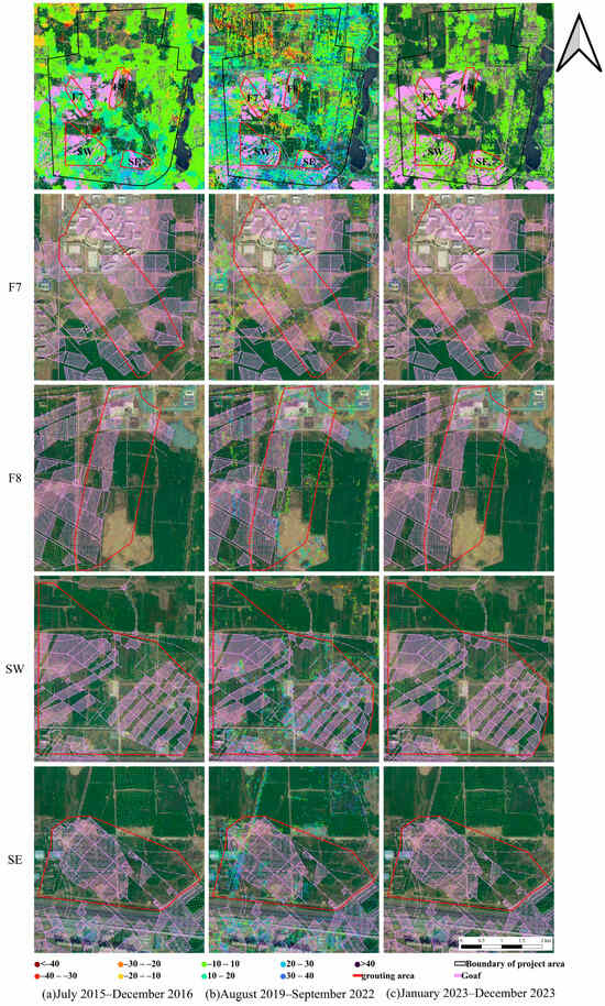 - Through an examination of regional subsidence rates, cumulative settlement values over time, and typical coherent points, the study outlines the distribution characteristics of surface deformation in the research area across the pre-grouting, grouting, and post-grouting stages. The findings show the progression of surface deformation patterns, indicating that prior to grouting, mining activities lead to surface subsidence and residual deformation. During grouting, the deformation gradually shifts to subsidence and uplift, and following grouting, the deformation stabilizes.