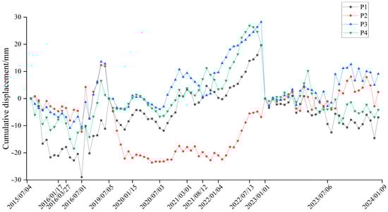 Analysis of the surface subsidence monitoring results indicates that between August 2019–September 2022 and January–December 2023, ground deformation within the study area remained limited. To investigate subsidence patterns at representative coherent points, four observation locations situated above the mined-out area were selected: P1 (117.4397° E, 36.6871° N), P2 (117.4324° E, 36.6850° N), P3 (117.4370° E, 36.6746° N), and P4 (117.4491° E, 36.6713° N). The spatial distribution of these points is illustrated in Figure 7, and their respective time-series cumulative deformation is shown in Figure 8.