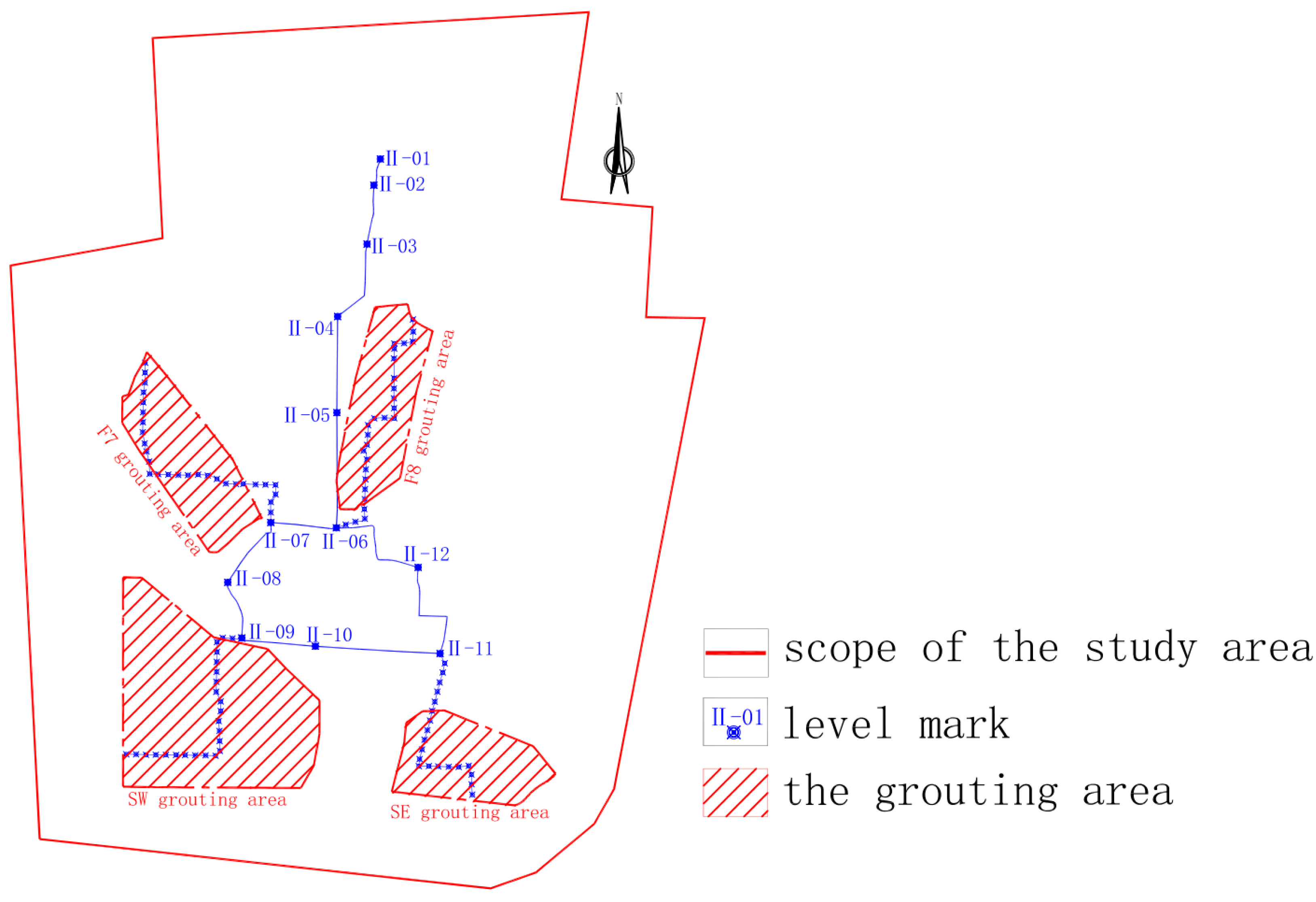 - Xu, L.; Guo, H.; Zhu, N.; Qin, C. Study on residual deformation law of overlying rock strata and surface above old mined goaf under the building loading. Bull. Surv. Mapp. 2015, 5, 103–108. [Google Scholar]