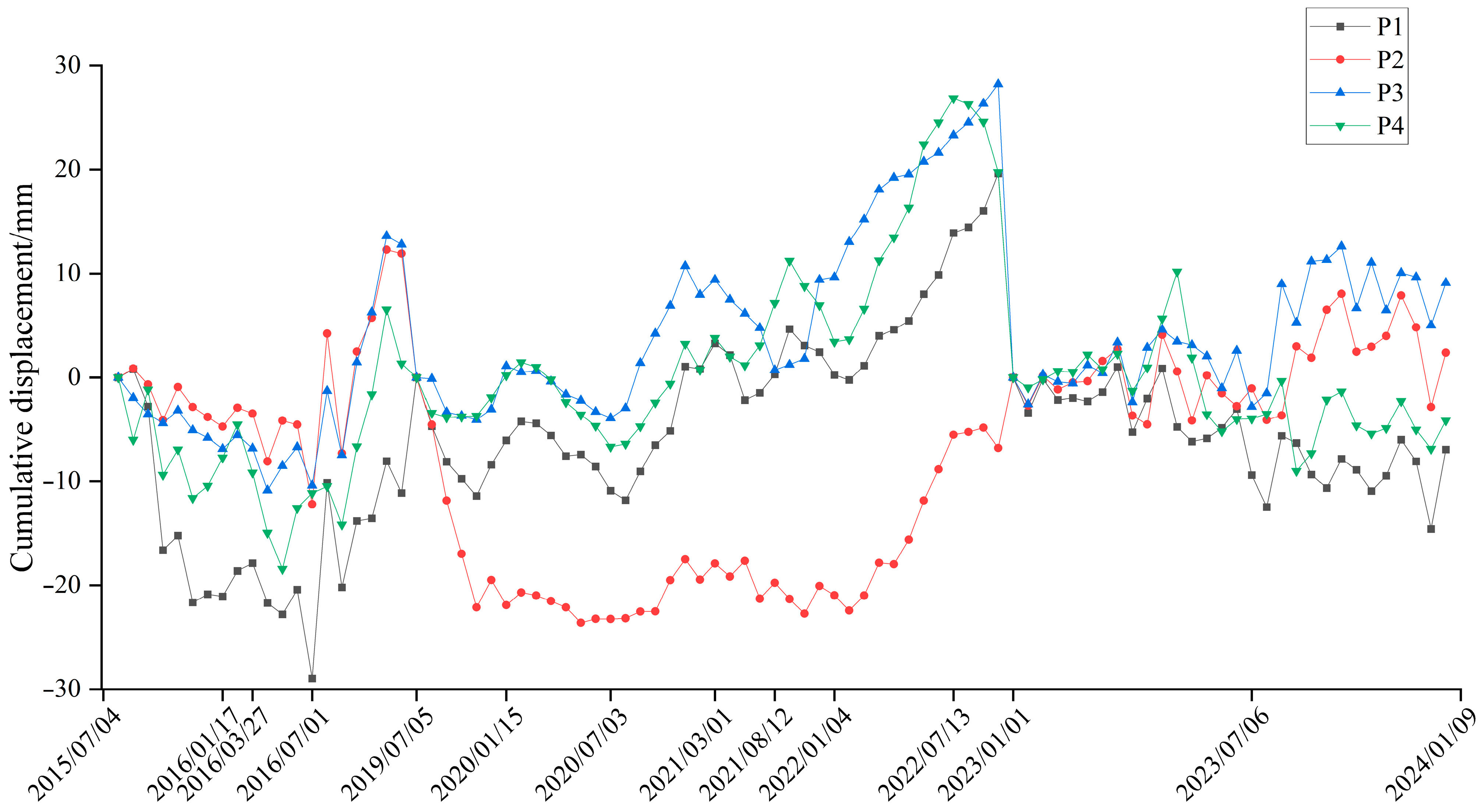 - Through the analysis of regional settlement rates, cumulative settlement values over time series, and typical coherent points, the distribution characteristics of surface deformation in the study area from before grouting, during grouting, and after grouting are obtained. This reveals the variation law of surface deformation in the study area, showing a transition from surface subsidence and residual deformation caused by mining before grouting to slow surface subsidence and uplift during grouting, and then to the stabilization of surface deformation after grouting. These results can provide effective technical support for mining activities and the management of the mining area.