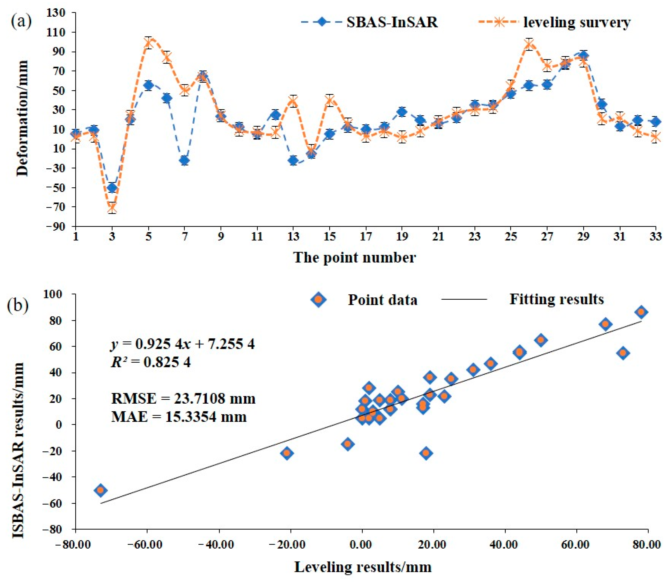 - An integrated approach to analyzing the spatio-temporal characteristics of surface deformation was developed by synthesizing multiple InSAR methodologies, including D-InSAR, PS-InSAR, and SBAS-InSAR. This method applies a strategy to select image pairs with optimal spatial and temporal baselines from SBAS images. Using D-InSAR as the foundation, an interferogram collection is generated, and stable coherent target points are identified through the PS method. The phase information of these coherent target points is resolved to derive surface subsidence rates and time series. The comparison with the leveling measurement data shows that the accuracy of this method meets the requirements and it is suitable for monitoring the residual deformation of the surface after grouting