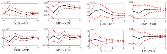 Figure 7. Based on the impulse response function of mixed frequency VAR, the weekly price change index MP of metals, the weekly price change index APP of agricultural products, the weekly price change index ESP of energy, the weekly price change index CP of chemical products and the surveyed urban unemployment rate YUR of the population aged 16–24 are plotted in the weekly range h = 0, 1, … The impulse response function (IRF) of 6. The 95% confidence interval was constructed by the parametric bootloader method and repeated 500 times.