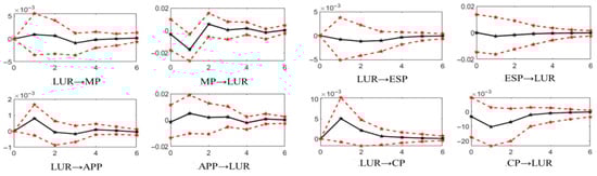 Figure 8. Based on the impulse response function of mixed frequency VAR, the weekly price change index MP of metals, the weekly price change index APP of agricultural products, the weekly price change index ESP of energy, the weekly price change index CP of chemical products and the surveyed urban unemployment rate LUR of the population aged 25–59 are plotted in the weekly range h = 0, 1, …. The impulse response function (IRF) of 6. The 95% confidence interval was constructed by the parametric bootloader method and repeated 500 times.
