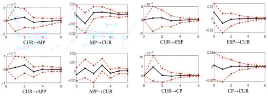 Figure 9. Based on the impulse response function of the mixed frequency VAR, the weekly price change index MP of metals, the weekly price change index APP of agricultural products, the weekly price change index ESP of energy, the weekly price change index CP of chemical products and the surveyed urban unemployment rate CUR of 31 major cities are plotted in the weekly range h = 0, 1, … The impulse response function (IRF) of 6. The 95% confidence interval was constructed by the parametric bootloader method and repeated 500 times.