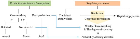 Stakeholders face systemic challenges in verifying corporate environmental transparency, relying on often inaccurate or incomplete signals from firms []. Consumer preference for green products exacerbates this issue, as exaggerated environmental claims can boost sales by up to 20% in competitive markets [,], with 98% of green products globally estimated to involve some form of greenwashing [,]. Traditional regulatory efforts to combat such practices are hindered by inherent information asymmetry: authorities struggle to verify the authenticity of green product claims across multi-tiered supply chains, facing prohibitive costs and oversight gaps [,]. For instance, validating a core manufacturer’s “carbon-neutral” production claim requires tracing raw material extraction, energy usage, and logistics across dozens of upstream suppliers—a process prone to data manipulation and concealment []. Notably, government-enterprise collaboration has been identified as a key strategy to address these gaps, though its effectiveness depends on aligned incentives, clear regulatory frameworks, and consumer value perception [].