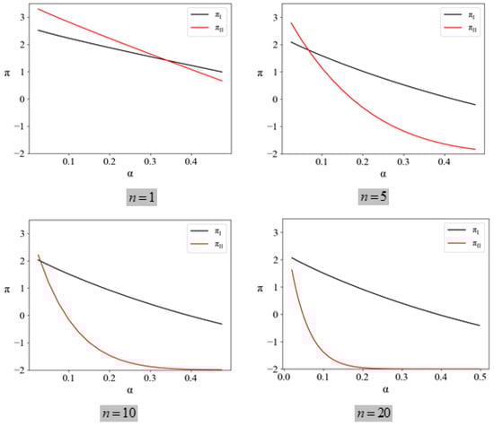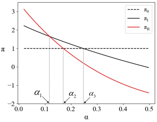 In Figure 2, represents the profit that a company can obtain through real green production, and and represent the intersection of the profits from real production and greenwashing by companies under the two regulatory models, respectively. As shown, a company will only abandon greenwashing when its expected profit is lower than that of real green production. When the core company uploads low-quality information to the blockchain, taking cover-up measures after greenwashing creates substantial information asymmetry, putting the regulator at a disadvantage. In such cases, the regulator is more inclined to choose the higher expected profit from greenwashing rather than real green production. When regulators have access to higher-quality verifiable information to identify greenwashing behavior, the core company receives fewer expected benefits from greenwashing and is more likely to employ real green production. indicates that a core company under DSCR is more likely to provide true information when certain conditions are satisfied.