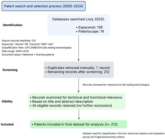 In July 2025, a comprehensive patent landscape review was performed using two major international repositories: Espacenet, managed by the European Patent Office, and Patentscope, administered by the World Intellectual Property Organization (Figure 1). Together, these databases cover more than one hundred jurisdictions, providing free access to both published applications and granted patents. The analysis was restricted to patent data rather than scientific publications because the objective was to trace the direction of applied technological development and the priorities of commercial and industrial innovation. Unlike scientific articles, which primarily reflect academic research, patents provide a direct measure of technologies intended for market deployment. Given the study’s focus on innovation pathways and industrial bias, patents offer a more appropriate and complementary proxy for examining the bioeconomy sericulture. The search protocol was adapted from the systematic approach described by Suárez et al. [32].