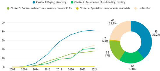The figure shows that energy-intensive drying and steaming systems represent the dominant trajectory, with a sharp rise after the mid-2010s, followed by stabilization, suggesting both technological maturity and possible saturation. Automation of end-finding, feeding, and twisting and control architectures based on sensors, motors, and PLCs followed similar upward trends, albeit at a slower pace, reflecting industry efforts to digitalize and streamline reeling processes. In contrast, specialized components and materials form a small but persistent cluster, indicating incremental innovation focused on durability, precision, and subsystem optimization.