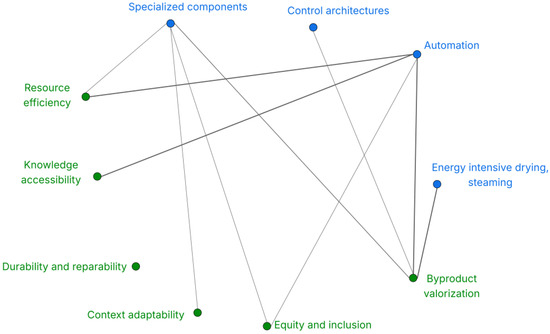 For specialized components, the link to resource efficiency was formed through descriptions of simplified or low-cost guiding elements. Context adaptability was established by the explicit use of “household” and “rural” in relation to small devices. Mentions of “ergonomics” connected this cluster to equity and inclusions, while references to fibroin and pupae provided the connection to by-product valorization.