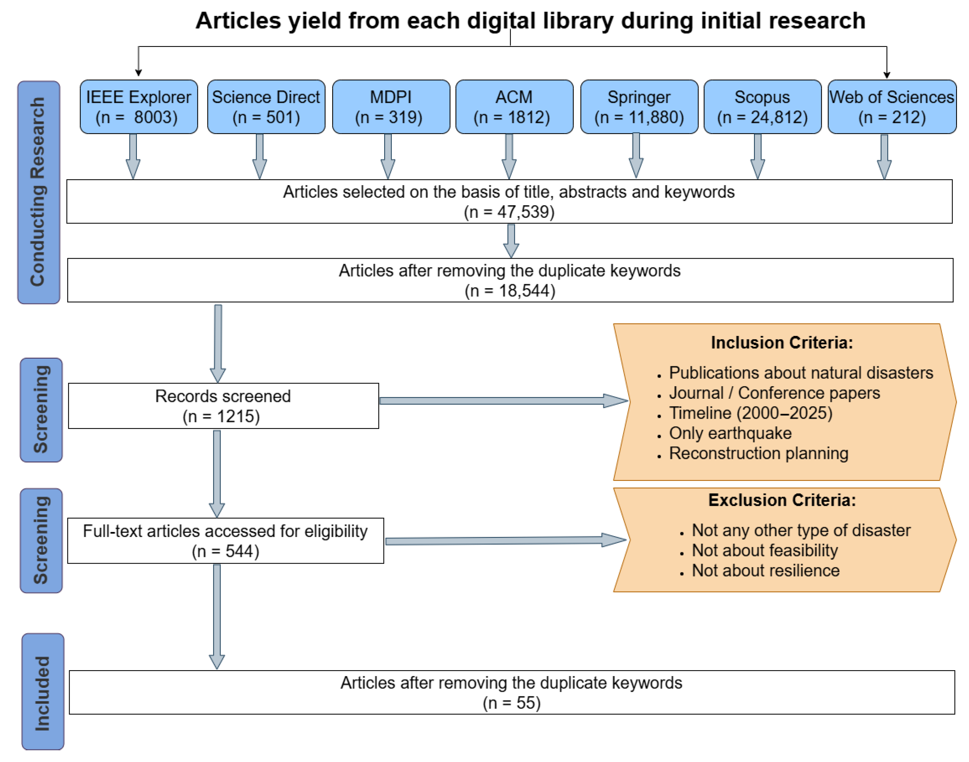 - RQ2: What approaches are used to address post-disaster reconstruction issues?Aim: The aim of this RQ is to focus on identifying the kind of proposed approaches e.g., Machine Learning, to handle the post-disaster situation.Rationale: On behalf of RQ2 we have clearly defined the criteria about the inclusion of primary studies, anything outside of these criteria will be excluded.