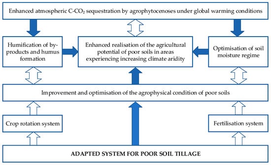 A schematic representation of these interactions is shown in Figure 2. It illustrates that atmospheric CO2 deposition by agrophytocenoses in multi-rotational crop systems and soil formation (organic matter deposition into humus) should be considered structural components of a unified system. These components interact synergistically and accumulate cumulatively under the influence of soil-protective cultivation practices in agrocenoses (Figure 2).