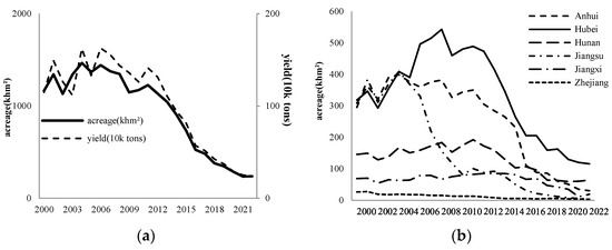 Changes in the cotton-growing areas in the Middle and Lower Reaches of the Yangtze River: 2000–2022. (a) Cotton planting acreage and yield in the Middle and Lower Reaches of the Yangtze River by years; (b) Cotton planting acreage of six provinces by year.