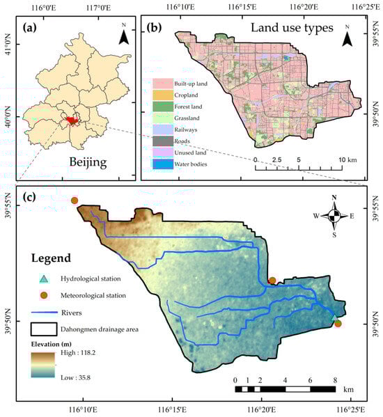 Spatial information of the study area: (a) location in Beijing; (b) land use types; (c) elevation, river network, and locations of hydrological and meteorological stations.