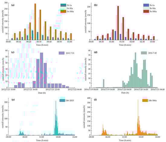 Rainfall processes: (a,b) short-duration events, (c–f) long-duration events.