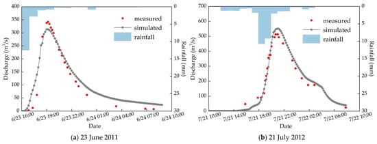 Figure 4 presents the measured and simulated flow hydrographs at the main outlet of the study area, Dahongmen Gate. The simulated hydrographs closely match the observed ones in both peak timing and magnitude, indicating that the ICM model reliably reproduces the flood flow hydrographs.