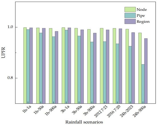 Node-, pipe-, and regional-scale UPFR under different rainfall scenarios.