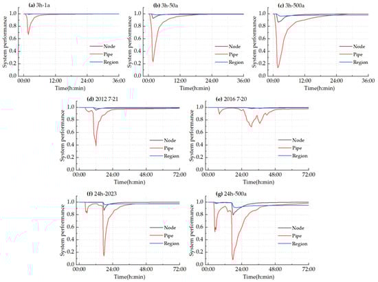 System performance curves at node, pipe, and regional scales under different rainfall scenarios. (a–c) short-duration rainfall, (d–g) long-duration rainfall.
