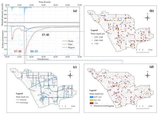 System performance and waterlogging under the 24h-500a rainfall scenario: (a) performance curves at node, pipe, and regional scales; (b–d) waterlogging distribution at node, pipe, and regional scales.