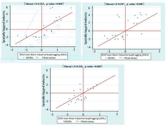 Moran scatterplot of the efficiency of industrial leapfrogging between east and west in 2014, 2019, and 2024.