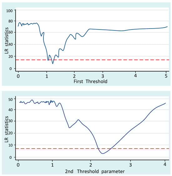 To more accurately analyze the mechanisms by which artificial intelligence technology spillovers and sustainable innovation drive leapfrog industrial development in eastern and western regions while eliminating interference from other influencing factors, this paper combines data availability with existing research [,], and takes the level of economic development (ED), the level of human capital (HC), the degree of openness to the outside world (OEW), the advanced industrial structure (ASI), the intensity of government intervention (GI), and the level of financial development (FD) as the control variables, in order to eliminate the problem of endogeneity resulting from omitting the important explanatory variables. Among them, the level of economic development (ED) is measured by the logarithm of GDP per capita (lnGDP); the level of human capital (HC) is characterized by the number of college students per 10,000 people (College); the degree of openness to the outside world (FDI) is measured by the share of foreign direct investment (FDI) in the GDP; the advanced industrial structure (IS) is calculated by the ratio of the added value of the tertiary industry to the added value of the secondary industry (T/S); government intervention intensity (GI) is measured by the share of fiscal expenditure in GDP of each province (Fiscal/GDP); and the level of financial development (FD) is taken as the logarithm of the added value of the financial industry (lnFin).