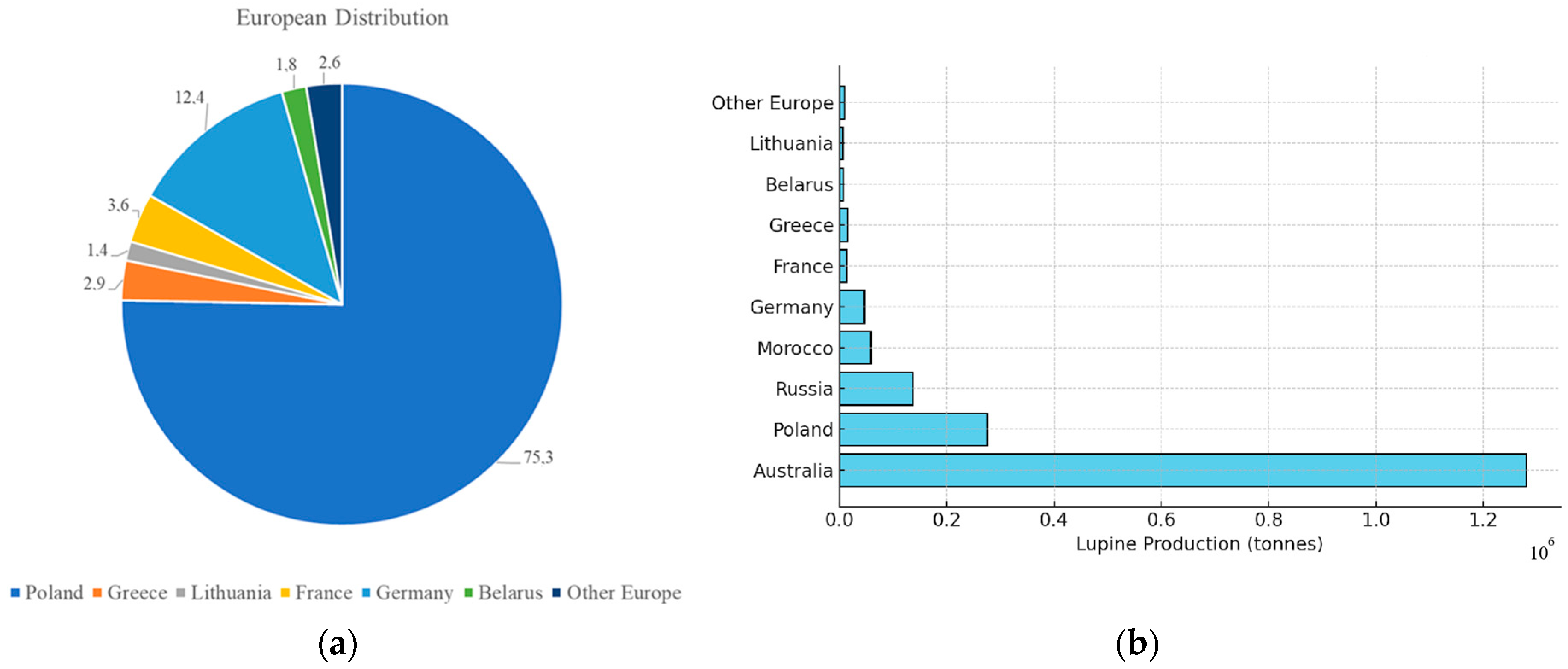 Statistical data (2023): (a)—Lupins harvested in Europe, (b)—Top lupin-producing countries [30,31,32,33,34].