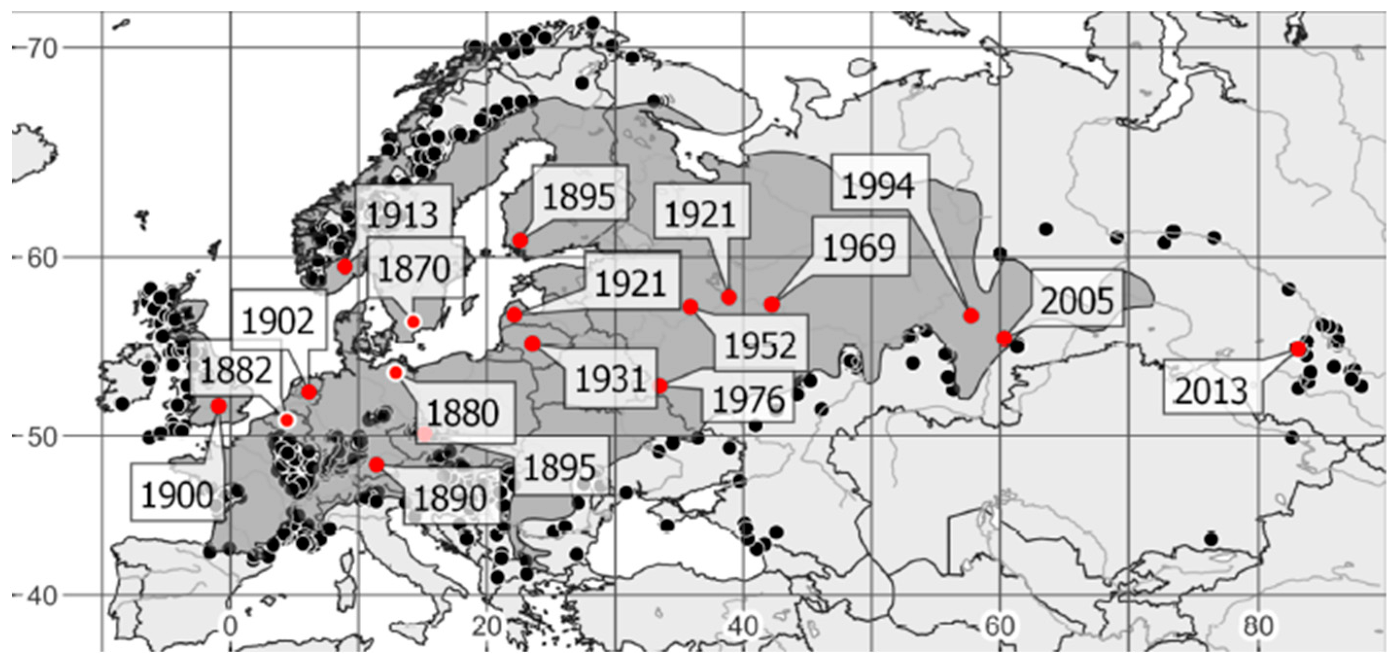 Distribution of Lupinus polyphyllus in Europe: ●; numbers give the first records for the species in different countries/regions: ● [35].
