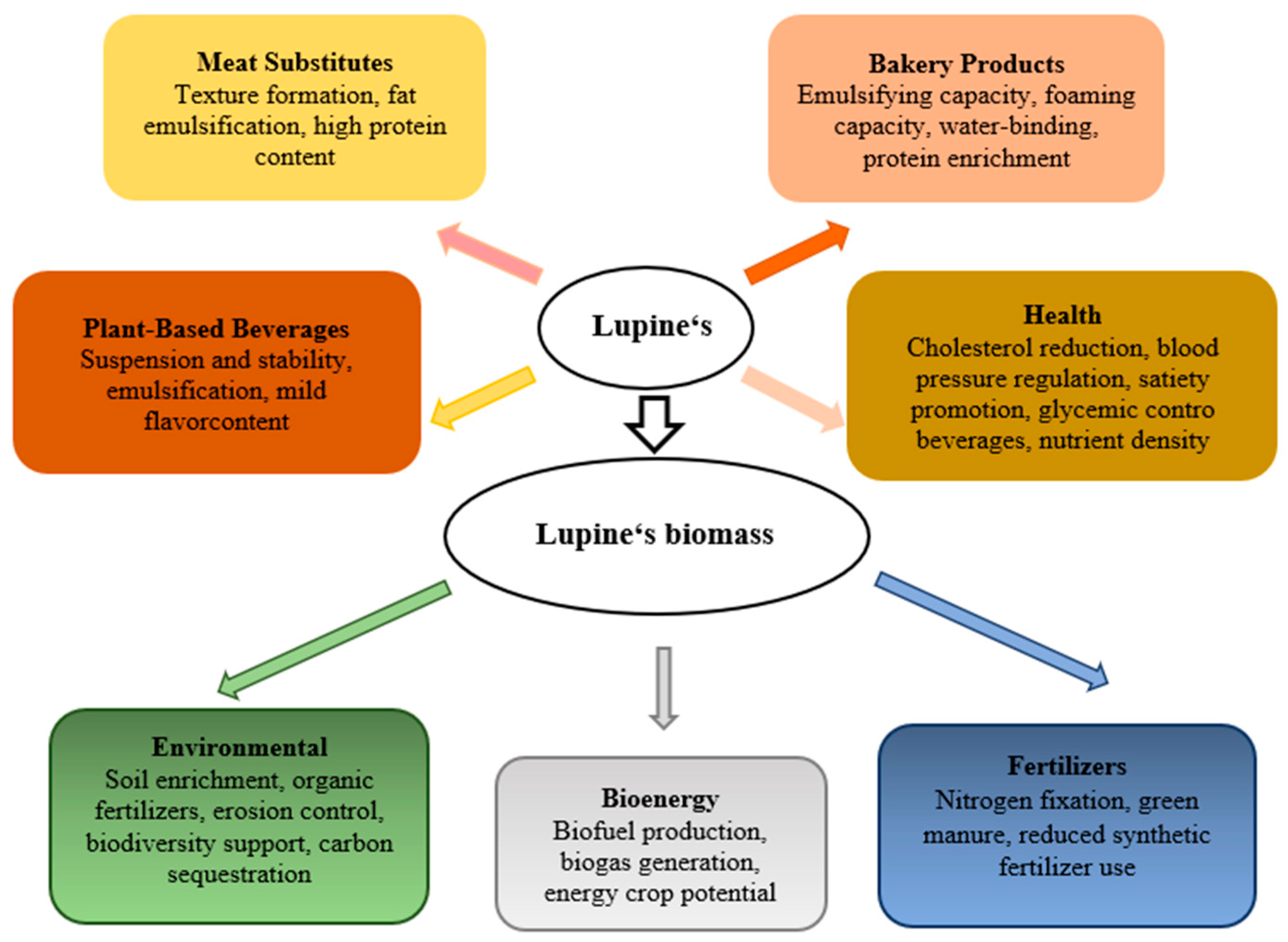 Lupin flours and protein isolates are used in bakery goods, meat substitutes, and plant-based beverages due to their emulsifying and foaming capacities. Nutritionally, lupins contribute to lowering LDL cholesterol, stabilizing blood pressure, and promoting satiety. Given global population growth, resource scarcity, and rising food demand, enhancing the added value of lupin-based ingredients represents a crucial strategy for achieving sustainable nutrition and food security [49,55].