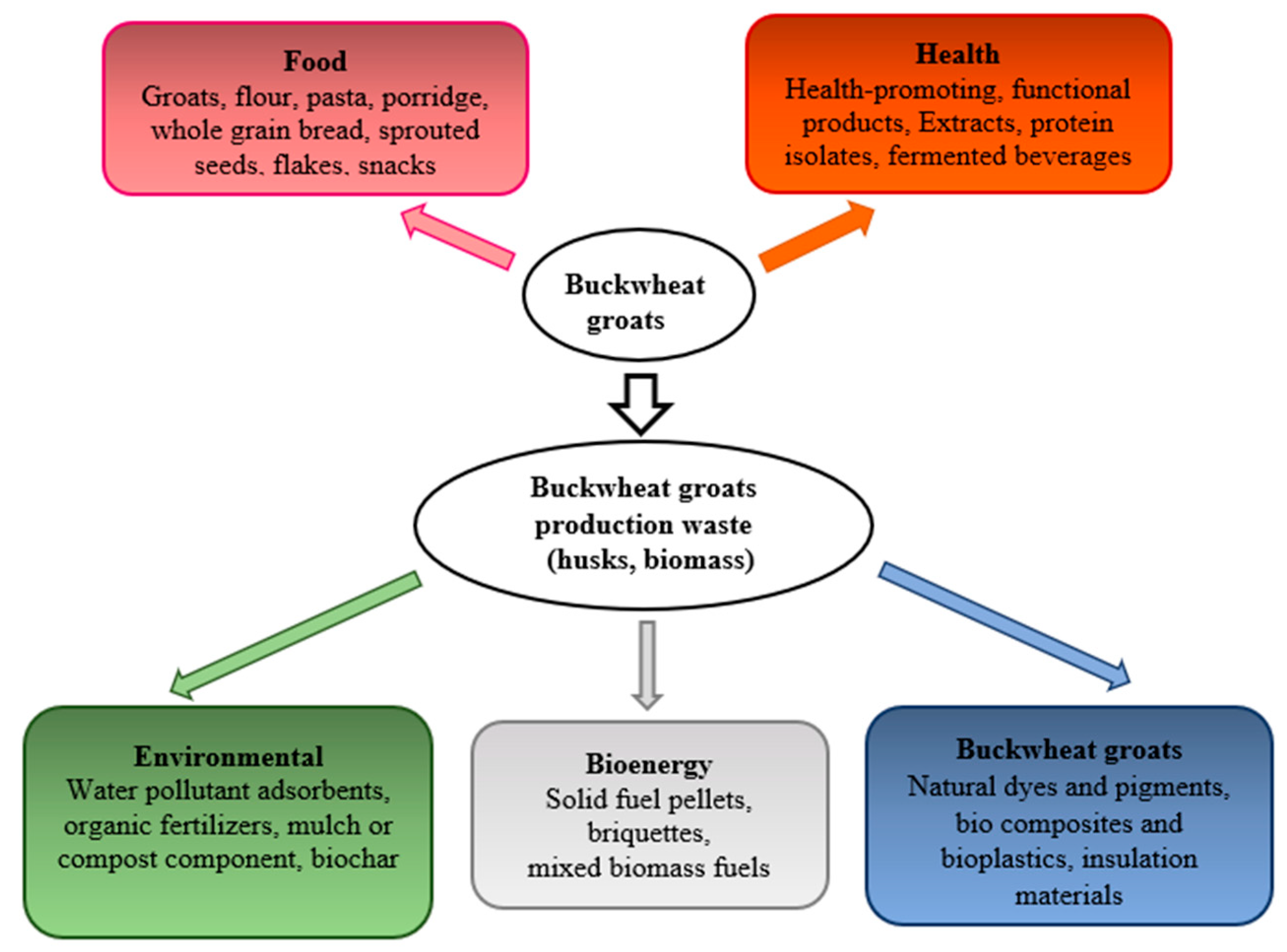 One of the most promising directions in the sustainable use of buckwheat lies in its potential for functional food production. Buckwheat contains phenolic compounds, flavonoids (especially rutin), antioxidants, and dietary fibre, which collectively exhibit anti-inflammatory, anticarcinogenic, and antioxidant properties beneficial to human health [87]. As a gluten-free pseudocereal, it is particularly valuable for specialized and preventive diets. Similar conclusions were reported by Lițoiu [88], who emphasized its richness in proteins, minerals, B-group vitamins, and phenolic compounds. These features enable the development of low-calorie, high-protein, and health-promoting foods. Beyond traditional groats, innovative processing methods expand buckwheat’s value chain. Studies highlight the potential for producing beverages, extracts, protein isolates, and fermentation products with enhanced bioactivity. Wang, N. [89] showed that germination significantly increases flavonoid, phenolic, and antioxidant contents in Fagopyrum tataricum sprouts, suggesting that both grains and sprouts represent valuable raw materials for high-value food ingredients. Collectively, these studies demonstrate that buckwheat valorisation in the food sector links nutrition enhancement with the reduction in processing waste, offering a model for sustainable and health-oriented product development.