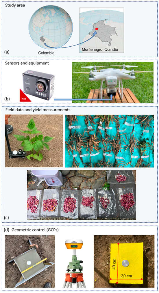 Overview of the study area and the methodological framework for data acquisition. (a) Geographical context (Map group): global and national maps showing the location of the study site in Montenegro, Quindío, Colombia. (b) Sensors and equipment: MAPIR Survey2 NIR camera and UAV platform used for aerial data acquisition. (c) Field data and yield measurements: TRAC optical canopy analyzer operating in the field, identification of individual plants before harvest, and dry grain samples corresponding to each plant. (d) Geometric control (GCPs): concrete geodetic benchmark during casting, static GNSS survey of the reference base, and completed benchmark (40 × 30 cm) with reflective target.