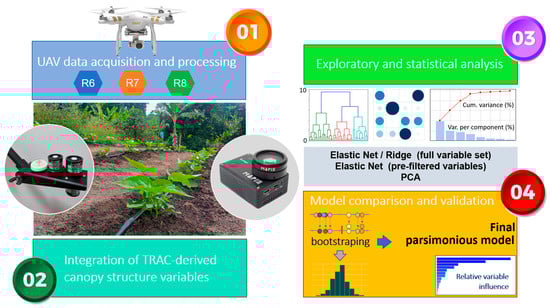 Conceptual workflow illustrating the four stages of the methodological design: (1) UAV data acquisition and processing at phenological stages R6–R8, (2) integration of TRAC-derived canopy structure variables, (3) exploratory and statistical analysis of biophysical and structural attributes, and (4) model comparison and validation leading to the final parsimonious model. This schematic summarizes the logical flow from data collection to model development and validation.