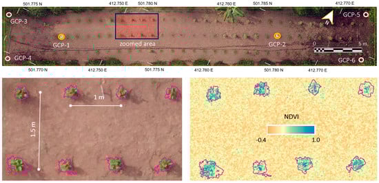 UAV-derived orthomosaic of the study plot at phenological stage R6. The upper panel shows the experimental area with six geometric control points (GCP1–GCP6) used for geometric adjustment and georeferencing (mean positional uncertainty: ±0.01 m in latitude, ±0.01 m in longitude, and ±0.01 m in elevation). The blue rectangle indicates the subsection displayed below. The lower-left panel illustrates individual plant segmentation based on the 1.0 × 1.5 m planting framework, while the lower-right panel presents the corresponding NDVI map with segmented canopies used to extract spectral metrics at the plant level. Segmented canopies are shown in a single magenta color for visual delineation only.