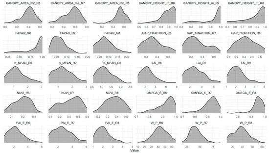 Structural predictors also showed broad ranges: canopy projected area (CANOPY_AREA_m2) varied from 0.02 to 0.79 m2, and canopy height (CANOPY_HEIGHT_m) from 0.22 to 1.0 m. Both variables tended to reach higher values at R6 and R8, as shown in the univariate distributions (Figure 4).