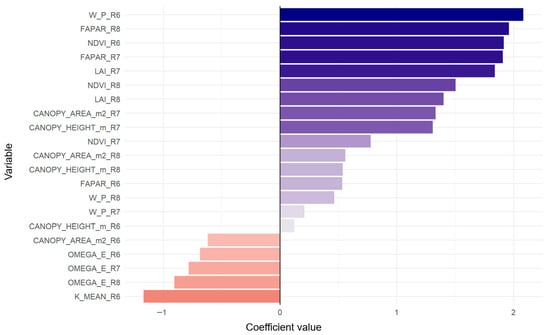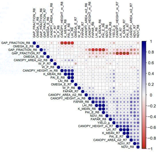 The analysis matrix comprised 30 predictors derived from 10 biophysical and structural variables (Wp, Kmean, gap fraction, Ωe, PAIe, LAI, FAPAR, NDVI, projected area, and canopy height), each recorded at three phenological stages (R6, R7, and R8). The response variable was dry grain weight per plant.