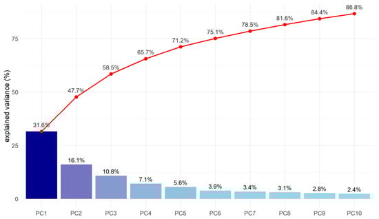 The PCA applied to the standardized predictors explained 48% of the total variance in the first two components (PC1 ≈ 31.6%; PC2 ≈ 16.1%). From PC3 onward, the cumulative contribution increased only marginally; therefore, interpretation focused on the first two axes (Figure 6).