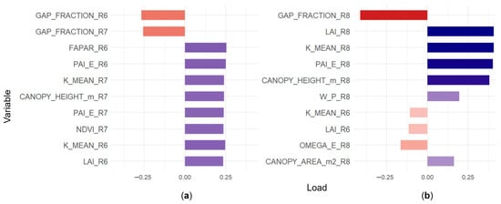 Principal component loadings. (a) Loadings for PC1, representing canopy vigor and radiation interception in R6–R7. (b) Loadings for PC2, associated with mature canopy architecture in R8.